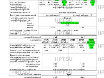 | Максимальная масса | Колесной формулой 4 x 2 и двигателем 306PS (250 кВт): 2000 кг. Колесной формулой 4 x 2 и двигателем 306PS (280 кВт), 508PS (405 кВт): 2050 кг. Колесной формулой 4 x 4 и двигателем 306PS, 508PS (405 кВт), 508PS (423 кВт): 2150 кг. Для модификаций с кузовом купе, колесной формулой 4 x 2 и двигателем 306PS (250 кВт): 2000 кг. Для модификаций с кузовом купе, колесной формулой 4 x 2 и двигателем 306PS (280 кВт), 508PS (405 кВТ): 2050 кг. Для модификаций с кузовом купе, колесной формулой 4 x 4 и двигателем 306PS, 508PS (405 кВт), 508PS (423 кВт): 2150 кг. |