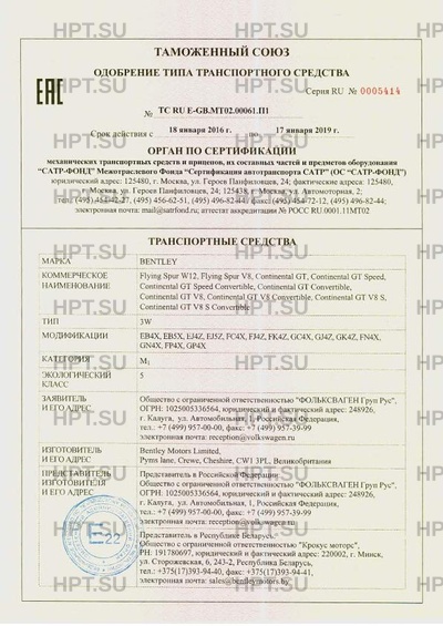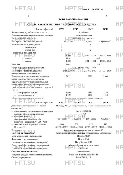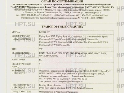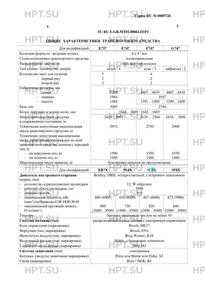 | Тип ТС | Применимость коммерческих наименований к обозначениям модификаций: Flying Spur W12 - EB4X, EB5X Continental GT Convertibl - GN4X Flying Spur V8 - EJ4Z, EJ5Z Continental GT V8 - FJ4Z Continental GT - FN4X Continental GT V8 Convertible - GJ4Z Continental GT Speed - FC4X, FP4X Continental GT V8 S - FK4Z Continental GT Speed Convertible - GC4X, GP4X Continental GT V8 S Convertible - GK4Z Flying Spur W12 S - EC4X, EC5X Flying Spur V8 S - EK4Z, EK5Z Continental Supersports - FR4X |