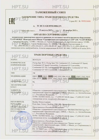 | Предприятие-изготовитель | Bentley Motors Limited, Pyms lane, Crewe, Cheshire, CW1 3PL, Великобритания |