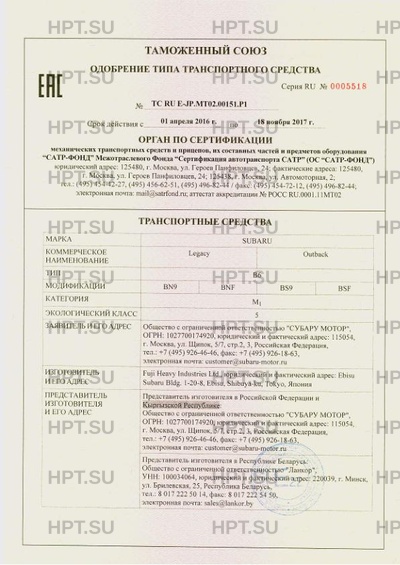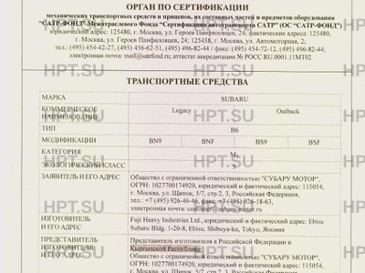 Заявитель Общество с ограниченной ответственностью "Субару Мотор", ОГРН 1027700174920, 115054, г. Москва, ул. Щипок, 5/7, стр.2, 3, Российская Федерация,тел. +7 (495) 926-46-46, факс: +7 (495) 926-18-63, электронная почта: customer@subaru-motor.ru