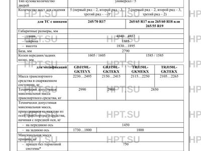 | Кол-во мест для сидения (M2, M3, L) | 5 (первый ряд - 2, второй ряд - 3, третий ряд - -) 7 (первый ряд - 2, второй ряд - 3, третий ряд - 2) для ТС с шинами 245/70 R17 265/65 R17 или 265/60 R18 или 265/55 R19 |
