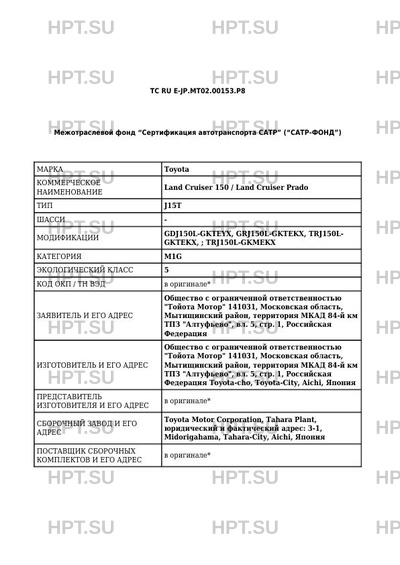 | Номер документа | ТС RU Е-JP.МТ02.00153.Р8 |
