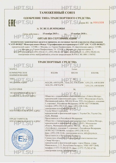| Заявитель | Общество с ограниченной ответственностью "Тойота Мотор", 141031, Московская область, Мытищинский район, МКАД, 84-км, ТПЗ "Алтуфьево", владение 5, строение 1, Российская Федерация, ОГРН: 1027739386400, телефон: (495) 258-34-65, факс: (495) 258-34-66, электронная почта: info@toyota.ru |