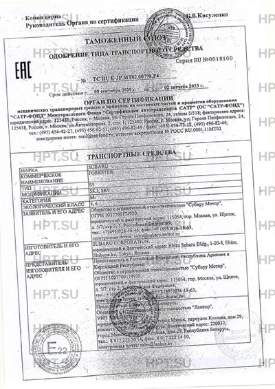 Представитель изготовителя Представитель в Российской Федерации, Республике Армения и Киргизской Республике: Общество с ограниченной ответственностью "СУБАРУ МОТОР". 115054, г. Москва, ул. Щипок, 5/7, стр.2, 3, Российская Федерация. ОГРН: 1027700174920. Тел. +7 (495) 926-46-46. Факс +7 (495) 926-18-63. Представитель в Республике Беларусь: Общество с ограниченной ответственностью "Ланкор", УНП 100034064, юридический адрес: 220037, город Минск, переулок Козлова, дом 29, комната 3, Республика Беларусь, фактический адрес: 220037, город Минск, переулок Козлова, дом 29, Республика Беларусь, тел.: 8 017 222 50 14, факс: 8 017 222 54 50, электронная почта: sales@lankor.by Представитель в Республике Казахстан: Товарищество с ограниченной ответственностью "Subaru Kazakhstan", БИН 090440006900, юридический и фактический адрес: 050000, город Алматы, Бостандыкский район, проспект Аль-Фараби, дом 107, Республика Казахстан, тел.: +7 (727) 333-15-87, факс: -, электронная почта: spk@subaru.kz