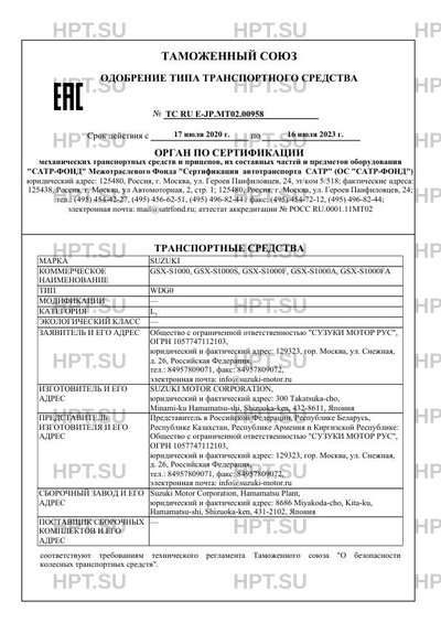 | Заявитель | Общество с ограниченной ответственностью "СУЗУКИ МОТОР РУС", ОГРН 1057747112103, юридический и фактический адрес: 129323, гор. Москва, ул. Снежная, д. 26, Российская Федерация, тел.: 84957809071, факс: 84957809072, электронная почта: info@suzuki-motor.ru |