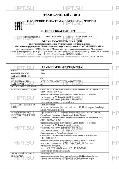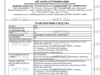 Предприятие-изготовитель Kia Corporation, место нахождения и фактический адрес: 12, Heolleung-ro, Seocho-gu, Seoul, Республика Корея