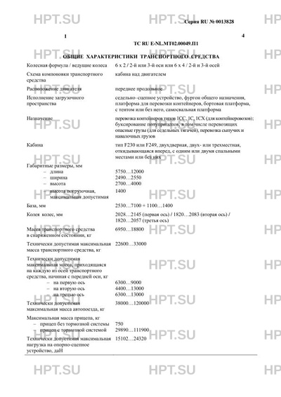 | Тип ТС | В случае несоответствия параметров транспортных средств значениям, установленным в пунктах 2.1 и 2.2 приложения № 5 к техническому регламенту Таможенного союза "О безопасности колесных транспортных средств", для передвижения транспортных средств по территории государств - членов Таможенного союза необходимо оформление специального разрешения. Транспортные средства допускаются к буксировке полуприцепов, перевозящих опасные грузы, при наличии на табличке изготовителя или на табличке с перечнем номеров официальных утверждений обозначения транспортного средства согласно классификации ДОПОГ и номера сообщения об официальном утверждении по Правилам ООН № 105. Транспортные средства, оснащенные двигателями MX-11 ??? H? и MX-13 ??? H?, соответствуют европейским экологическим нормам Euro-6. |