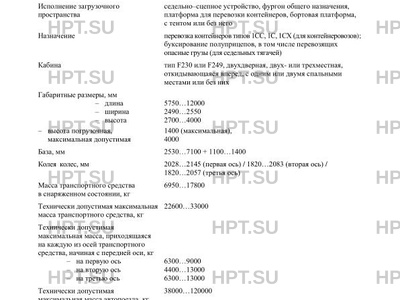 | Дополнительная информация | В случае несоответствия параметров транспортных средств значениям, установленным в пунктах 2.1 и 2.2 приложения № 5 к техническому регламенту Таможенного союза «О безопасности колесных транспортных средств», для передвижения транспортных средств по территории государств — членов Таможенного союза необходимо оформление специального разрешения. Транспортные средства, имеющие на табличке изготовителя сведения о соответствии требованиям Правил ЕЭК ООН № 105 и сведения о классе транспортного средства в соответствии с ДОПОГ, допускаются к буксированию полуприцепов, перевозящих опасные грузы. Транспортные средства, оснащенные двигателями MX-11 ??? H1 и MX-13 ??? H1, соответствуют европейским экологическим нормам Euro-6. |