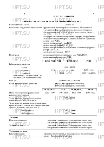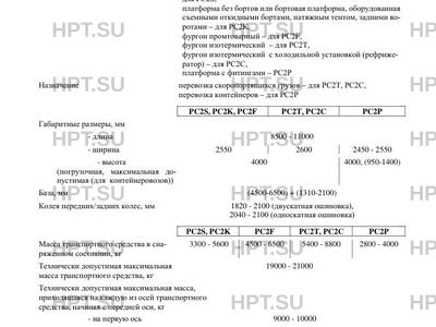 | Исполнение загрузочного пространства | грузовая открытая платформа или бортовая платформа или бортовая платформа, оборудованная съемными откидными бортами, каркасом и тентом, задними воротами или тентом - для PC2S, платформа без бортов или бортовая платформа, оборудованная съемными откидными бортами, натяжным тентом, задними воротами - для РС2К, фургон промтоварный - для PC2F, фургон изотермический - для РС2Т, фургон изотермический с холодильной установкой (рефрижератор) - для РС2С, платформа с фитингами - РС2Р |