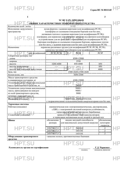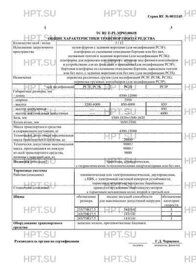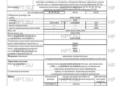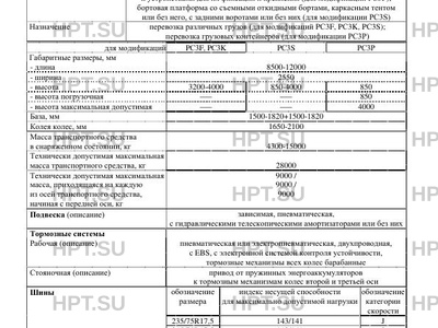 | Исполнение загрузочного пространства | кузов-фургон с задними воротами (для модификации PС3F); платформа со съемными откидными бортами или без них, натяжным тентом и задними воротами (для модификации PС3K); платформа для перевозки контейнеров с опорами под фитинги контейнеров и устройствами для их фиксации и крепления (для модификации PС3P); бортовая платформа со съемными откидными бортами, каркасным тентом или без него, с задними воротами или без них (для модификации PС3S) |