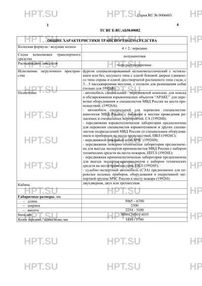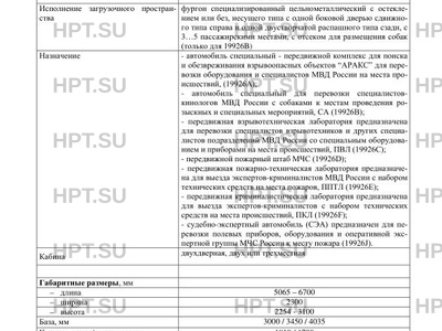 | Оборудование ТС | специальный предупреждающий огонь синего цвета - для автомобилей МВД, МЧС по заказу: отопитель салона, центральная блокировка дверей, подушки безопасности водителя и переднего пассажира, тягово-сцепное устройство, кондиционер (хладагент R134a), электропривод сдвижной двери, лабораторное оборудование, рундуки, сиденья и стол для проведения оперативных совещаний и следственных действий, отсек для размещения собак (для 19926B), СГУ – для автомобилей оперативных служб |