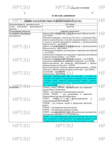 | Исполнение загрузочного пространства | фургон общего назначения с грузоподъемным бортом или без - для 278450; бортовая платформа с тентом или без него, с откидными боковыми и задним бортами, с высоким передним бортом, или кузов с тентом и задними распашными воротами, с грузоподъемным бортом или без - для 278452; фургон изотермический или рефрижератор с грузоподъемным бортом или без - для 278451; специальная платформа для эвакуации и перевозки автомобилей - для 278453; специальная платформа для эвакуации и перевозки автомобилей с краном-манипулятором - для 27845J; бортовая платформа с краном-манипулятором - для 27845В, подъемное оборудование с рабочей платформой - для 27845R; фургон-мастерская для перевозки оборудования с краномманипулятором или без него - 278456; фургон-мастерская с бортом с краном-манипулятором - 27845Z; самосвал с краном-манипулятором или без него - для 27845Y; мультилифт - для 27845V; автоцистерна - для 27845F; амбулифт, кейтеринговый лифт или автолифт, в составе конструкции, состоящей из подъмного механизма типа "ножницы" с кузовом, трапа, закрытой поднимающейся кабины, гидравлической и электрической систем с грузоподъемным бортом или без - для 278459. |