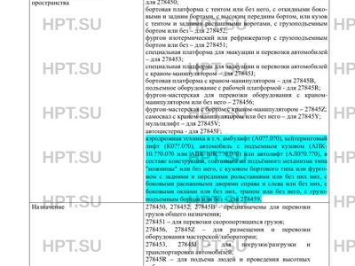 | Исполнение загрузочного пространства | фургон общего назначения с грузоподъемным бортом или без - для 278450; бортовая платформа с тентом или без него, с откидными боковыми и задним бортами, с высоким передним бортом, или кузов с тентом и задними распашными воротами, с грузоподъемным бортом или без - для 278452; фургон изотермический или рефрижератор с грузоподъемным бортом или без - для 278451; специальная платформа для эвакуации и перевозки автомобилей - для 278453; специальная платформа для эвакуации и перевозки автомобилей с краном-манипулятором - для 27845J; бортовая платформа с краном-манипулятором - для 27845В, подъемное оборудование с рабочей платформой - для 27845R; фургон-мастерская для перевозки оборудования с краномманипулятором или без него - 278456; фургон-мастерская с бортом с краном-манипулятором - 27845Z; самосвал с краном-манипулятором или без него - для 27845Y; мультилифт - для 27845V; автоцистерна - для 27845F; аэродромная техника в т.ч. амбулифт (А0??.0?0), кейтеринговый лифт (К0??.0?0), автомобиль с подъемным кузовом (АПК- 10.??0.0?0 или АПК-10К.??0.0?0) или автолифт (АЛ0?0.??0), в составе конструкции, состоящей из подъмного механизма типа "ножницы" или без него, с кузовом бортового типа или фургоном с задними и передними рольставнями или без них них, с боковыми распашными дверями справа и слева или без них, с боковыми окнами или без них, трапом или без него, с грузоподъемным бортом или без - для 278459. |
