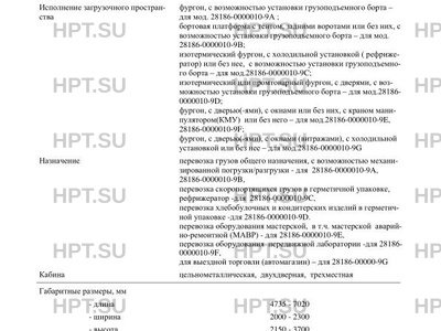 | Дополнительная информация | При изготовлении транспортных средств 28186-0000010-9 используются шасси ISUZU, тип NMR, модификации NMR85H, NMR85E, категории N1 . Транспортное средство 28186-0000010-9 с двигателем ISUZU, 4JJ1 (4JJ1E4NC) относится к экологическому классу 4, с двигателем ISUZU, 4JJ1 (4JJ1E5LD) — к экологическому классу 5. |