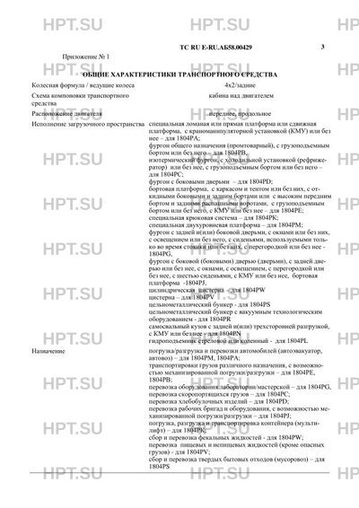 | Тип ТС | При изготовлении транспортных средств типа 1804Р используются шасси ISUZU, тип NМR, модификации NМR85Н, NМR85Е, категории N1. Транспортное средство типа 1804Р с двигателем ISUZU, 4JJ1 (4JJ1E4NC) относится к экологическому классу 4, с двигателем ISUZU, 4JJ1 (4JJ1E5LD) - к экологическому классу 5. Перевозка пассажиров в салоне автомобиля 1804РG запрещена?? Цистерна транспортных средств 1804РV не обладает изотермическими свойствами. |