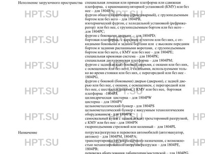 | Дополнительная информация | При изготовлении транспортных средств типа 1804Р используются шасси ISUZU, тип NМR, модификации NМR85Н, NМR85Е, категории N1. Транспортное средство типа 1804Р с двигателем ISUZU, 4JJ1 (4JJ1E4NC) относится к экологическому классу 4, с двигателем ISUZU, 4JJ1 (4JJ1E5LD) — к экологическому классу 5. Перевозка пассажиров в салоне автомобиля 1804РG запрещена?? Цистерна транспортных средств 1804РV не обладает изотермическими свойствами. |