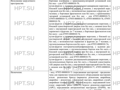 | Исполнение загрузочного пространства | бортовая платформа с краноманипуляторной установкой или без нее - для 47955-0000010-?9; кузов-фургон с задними распашными/одинарными воротами, с боковой одностворчатой дверью, с окнами, с внутренней перегородкой или без нее, с возможностью перевозки в фургоне до 7 человек; с бортовым фрагментом или без него, с краноманипуляторной установкой или без нее - для 47955-0000010-?1, 47955-00000010-?2, 47955-0000010-?3, 47955-0000010-?6, 47955- 0000010-?8; кузов-фургон с задними распашными/одинарными воротами, с боковой одностворчатой дверью или без нее, с окнами (или без них) с внутренней перегородкой или без нее, с возможностью перевозки в фургоне до 7 человек; с бортовым фрагментом или без него - для 47955-0000010-?4; кузов-фургон с задними распашными воротами, с боковой одностворчатой дверью, с окнами, внутренней перегородкой или без нее, с возможностью перевозки в фургоне до 7 человек; с грузоподъемным бортом или без него - для 47955-0000010-?А; кузов-фургон изотермический/рефрижератор, с задними распашными воротами, с грузоподъемным бортом или без него, с боковой одностворчатой дверью или без нее, с внутренней перегородкой или без нее, с окнами или без них, с холодильной установкой или без - для 47955-0000010-?5; кузов-фургон с задними распашными\одинарными воротами, с грузоподъемным бортом или без него, с боковой одностворчатой дверью или без нее, с внутренней перегородкой или без нее, с окнами или без них - для 47955-0000010-?7, 47955-0000010- ?В. |