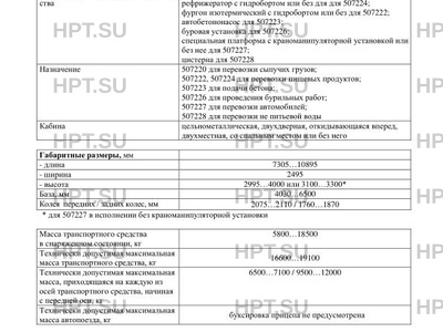 | Назначение | 507220 для перевозки сыпучих грузов; 507222, 507224 для перевозки пищевых продуктов; 507223 для подачи бетона; 507226 для проведения бурильных работ; 507227 для перевозки автомобилей; 507228 для перевозки не питьевой воды |