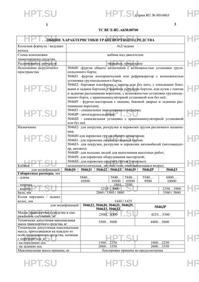 | Исполнение загрузочного пространства | 5046J0 -фургон общего назначения c возможностью установки грузоподъемного борта; 5046J1 -фургон изотермический или рефрижератор c возможностью установки грузоподъемного борта; 5046J2- бортовая платформа с тентом или без него, с откидными боковыми и задним бортами, с высоким передним бортом, или кузов с тентом и задними распашными воротами, c возможностью установки грузоподъемного борта, с краноманипуляторной установкой или без неё; 5046J9 - фургон-мастерская с окнами, боковой дверью и задними распашными воротами; 5046J3 - специальная эвакуаторная платформа; 5046JP - автогидроподъемник; 5046JZ - самосвальная установка с краноманипуляторной установкой или без неё. |