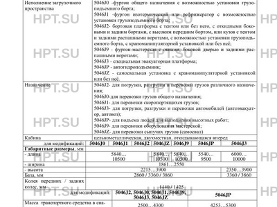 | Назначение | 5046J2- для погрузки, разгрузки и перевозки грузов различного назначения; 5046J0-для перевозки грузов общего назначения; 5046J1- для перевозки скоропортящихся грузов; 5046J3- для погрузки, разгрузки и перевозки автомобилей (автоэвакуатор, автовоз); 5046JP- для подъема людей для выполнения высотных работ; 5046J9- для перевозки оборудования мастерской; 5046JZ- для перевозки сыпучих грузов (самосвал) |