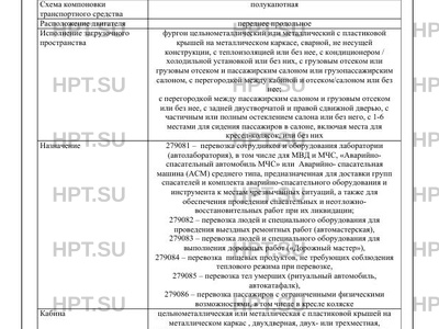 | Оборудование ТС | устройство вызова экстренных оперативных служб с ручным включением и автоматическим срабатыванием при опрокидывании , утеплитель облицовки радиатора(все), специальный предупреждающий огонь синего цвета, СГУ (для ТС специальных служб, МВД, МЧС), специальный предупреждающий огонь автожелтого цвета (279083) по заказу: совмещенная система вентиляции, отопления и кондиционирования (система управления климатом), предпусковой подогреватель, догреватель охлаждающей жидкости, противотуманные фары с дневными ходовыми огнями, зеркала с электроприводом, электростеклоподъемники, магнитола, круизконтроль, центральный замок , система мониторинга транспорта ГЛОНАСС, тахограф, дополнительный отопитель салона и/или грузового отсека, теплоизоляция фургона; стеллажи, подножки, багажные полки, шкафы, верстаки, столы, в том числе откидные, перегородки, крепления для специального оборудования, силиконовые шторки, противоугонное устройство, ФВУ, фараискатель, фонари наружного освещения, радиостанция, аварийновентиляционный люк, шторки на окнах, тонировка стекол, кронштейн крепления запасного колеса на задние двери; другое специальное и специализированное оборудование в соответствии с техническими условиями и / или техническими требованиями/заданием заказчика (все) подъемное устройство или аппарели и места для крепления креселколясок, устройство, препятствующее началу движения при открытых/не полностью закрытых служебных дверях, повторители аварийной сигнализации в задней части крыши (для 279086) ; крепление для гроба (для 279085), багажник на крыше, лестница, таль грузоподъемная, рейки и кольца такелажные (для 279081, 279082, 279083, 279084) аварийно-спасательное оборудование и инструмент, бортовое навигационно-связное оборудование (для 279081) |