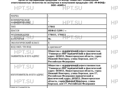 | Тип ТС | Транспортные средства изготавливаются на базе транспортных средств модификаций: 5299-0000017-52 Модификации - Категория: 178411 - M₃ класс II; 178412 - M₃ класс III |