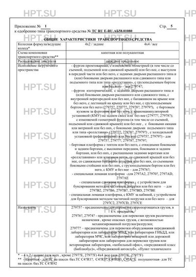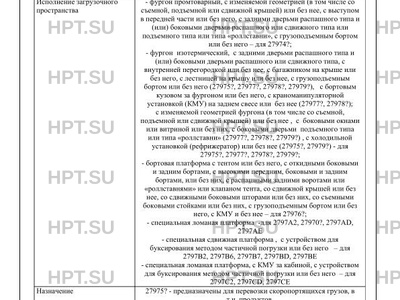Оборудование ТС устройство вызова экстренных оперативных служб с ручным включением и автоматическим срабатыванием при опрокидывании, дневные ходовые огни (все), система регулирования давления воздуха в шинах (для ТС на базе/шасси С4?А?3), система электронного контроля устойчивости (кроме ТС на шасси/баз. ТС С4?А?3) по заказу: предпусковой подогреватель, отопитель, аэродинамические спойлеры, обтекатель на кабину, система навигации, тахограф, дополнительные пневматические упругие элементы задней подвески, кондиционер, утеплитель облицовки, противотуманные фары, совмещенная система вентиляции, отопления и кондиционирования (система управления климатом) с ручным управлением, дополнительный отопитель, магнитола, держатель запасного колеса, фильтровентиляционная установка; багажник, лестница, оборудование для автономного электроснабжения, видео-аудиоаппаратура, подголовники сидений, дополнительный топливный бак и/или топливный бак увеличенной емкости (все) наружный воздухозаборник, тягово-сцепное устройство, пневмовыводы для подключения тормозной системы прицепа, розетка для подключения прицепа, противосолнечный экран кабины с огнями автопоезда, механическая лебедка – для ТС на базе/шасси С4?А?3; подушка безопасности водителя или подушка безопасности водителя и передних пассажиров– для ТС на базе/шасси С4?R92), устройство ограничения максимальной скорости (функцию устройства ограничения максимальной скорости выполняет электронный блок управления двигателем) –для ТС на шасси/баз.ТС C4?R?3) трансформируемые сиденья второго ряда – для ТС на базе/шасси С42R?? ; совещенная система вентиляции, отопления и кондиционирования (система управления климатом) с ручным управлением моторный тормоз-замедлитель (для ТС на шасси/баз.ТС С4?R13, С4?R33) спальный отсек на крыше кабины или за кабиной (для ТС на шасси/баз.ТС С41…, С42…) специальный предупреждающий огонь автожелтого цвета (2797A2, 2797B2, 2797C2, 279706, 279707, 2797B6, 2797B7, 2797AD, 2797BD, 2797CD , 2797AE, 2797BE, 2797CE); специальный предупреждающий огонь синего цвета, сигнально-громкоговорящее устройство (27977? (МВД, МЧС, ГИБДД)), холодильная установка - для 27975?, грузоподъемный борт - для 27975?, 27977?, 27978?, 27979?, 27976?, 27974?, КМУ – для 27976?, 27978?, 2797С2, 2797CD, 27976E, 27976F, 27978E, 27978F, 2797CE стеллажи, шкафы, рундуки, сиденья, столы, специальное оборудование - для 27977?, 27978?, 27979?; высокий передний борт, высокий задний борт, высокие боковые борта, боковые шторы, съемные стойки – для 27976?; сдвижная крыша, съемная крыша, подъемная крыша, – для всех, кроме 2797A2, 2797B2, 2797C2, 2797AD, 2797BD, 2797CD, 279706, 279707, 2797B6, 2797B7, 2797AE, 2797BE, 2797CE, 27975?; боковые двери, передвижные перегородки, стационарные перегородки – для всех, кроме 2797A2, 2797B2, 2797C2, 2797AD, 2797BD, 2797CD, 279706, 279707, 2797B6, 2797B7, 2797AE, 2797BE, 2797CE, 27976? окна – для 27977?, 27978?, 27979?