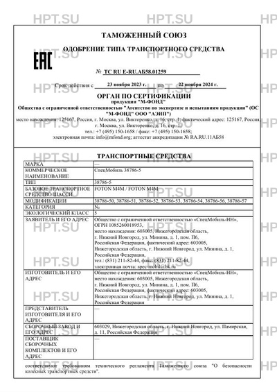 | Базовое ТС / Шасси | FOTON M4М / FOTON M4М |