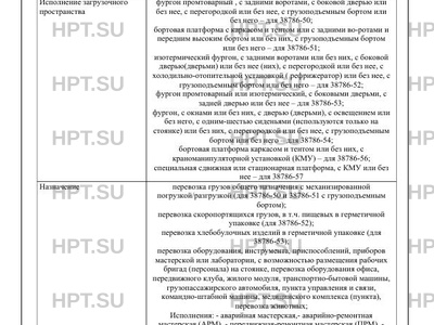 | Исполнение загрузочного пространства | фургон промтоварный , с задними воротами, с боковой дверью или без нее, с перегородкой или без нее, с грузоподъемным бортом или без него - для 38786-50; бортовая платформа с каркасом и тентом или с задними во-ротами и передним высоким бортом или без них, с грузоподъемным бортом или без него - для 38786-51; изотермический фургон, с задними воротами или без них, с боковой дверью(дверьми) или без нее (них), с перегородкой или без нее, с холодильно-отопительной установкой (рефрижератор) или без нее, с грузоподъемным бортом или без него - для 38786-52; фургон промтоварный или изотермический, с боковыми дверьми, с задней дверью или без нее - для 38786-53; фургон, с окнами или без них, с дверью (дверьми), с освещением или без него, с одним-шестью сиденьями (используются только на стоянке) или без них, с перегородкой или без нее, с грузоподъемным бортом или без него - для 38786-54; бортовая платформа каркасом и тентом или без них, с краноманипуляторной установкой (КМУ) - для 38786-56; специальная сдвижная или стационарная платформа, с КМУ или без нее - для 38786-57 |