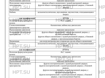 | Исполнение загрузочного пространства | фургон общего назначения с задней распашной дверью; фургон общего назначения с задней распашной дверью, с боковой дверью фургон общего назначения с задней распашной дверью, с грузоподъемным бортом; фургон общего назначения с задней распашной дверью, с боковой дверью, с грузоподъемным бортом фургон изотермический с задней распашной дверью; фургон изотермический с задней распашной дверью, с боковой дверью; фургон изотермический с задней распашной дверью, с грузоподъемным бортом; фургон изотермический с задней распашной дверью, с боковой дверью, с грузоподъемным бортом; фургон изотермический с задней распашной дверью, с ХОУ (холодильно-отопительной установкой); фургон изотермический с задней распашной дверью, с боковой дверью, с ХОУ (холодильно-отопительной установкой); фургон изотермический с задней распашной дверью, с грузоподъемным бортом, с ХОУ (холодильно-отопительной установкой); фургон изотермический с задней распашной дверью, с боковой дверью, с грузоподъемным бортом, с ХОУ (холодильноотопительной установкой); фургон рефрижератор с задней распашной дверью фургон рефрижератор с задней распашной дверью, с боковой дверью; фургон рефрижератор с задней распашной дверью, с грузоподъемным бортом; фургон рефрижератор с задней распашной дверью, с боковой дверью, с грузоподъемным бортом фургон с задней распашной дверью; фургон с боковыми дверьми; фургон с задней распашной дверью, с боковыми дверьми; фургон с задней распашной дверью, с ХОУ (холодильноотопительной установкой); фургон с боковыми дверьми, с ХОУ (холодильно-отопительной установкой); фургон с задней распашной дверью, с боковыми дверьми, с ХОУ (холодильно-отопительной установкой); фургон с задней распашной дверью, с грузоподъемным бортом; фургон с задней распашной дверью, с боковыми дверьми, с грузоподъемным бортом; фургон с задней распашной дверью, с ХОУ (холодильноотопительной установкой), с грузоподъемным бортом; фургон с задней распашной дверью, с боковыми дверьми, с ХОУ (холодильно-отопительной установкой), с грузоподъемным бортом бортовая платформа; бортовая платформа с каркасом и тентом; бортовая платформа с откидными боковыми и задним бортами, с высоким передним бортом; бортовая платформа с откидными боковыми и задним бортами, с высоким передним бортом, с каркасом и тентом; кузов с тентом и задними распашными воротами бортовая платформа, с грузоподъемным бортом; бортовая платформа с каркасом и тентом, с грузоподъемным бортом; бортовая платформа с откидными боковыми и задним бортами, с высоким передним бортом, с грузоподъемным бортом; бортовая платформа с откидными боковыми и задним бортами, с высоким передним бортом, с каркасом и тентом, с грузоподъемным бортом; кузов с тентом и задними распашными воротами, с грузоподъемным бортом фургон с окнами/дверьми - автомагазин; фургон с окнами/дверьми - автомагазин, с грузоподъемным бортом; фургон с окнами/дверьми - автолавка; фургон с окнами/дверьми - автолавка, с грузоподъемным бортом фургон с задней распашной дверью - автомастерская; фургон с задней дверью - автомастерская; фургон с боковой дверью - автомастерская; фургон с боковыми дверьми - автомастерская; фургон с задней распашной дверью, с боковой дверью - автомастерская; фургон с задней распашной дверью, с боковыми 