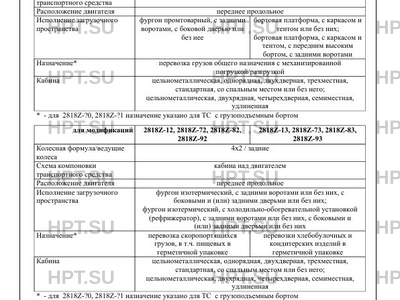 | Оборудование ТС | устройство вызова экстренных оперативных служб, дневные ходовые огни, система электронного контроля устойчивости - для всех; специальный предупреждающий огонь автожелтого цвета - для 2818Z-?4 (Дорожный мастер), 2818Z-?7, специальный предупреждающий огонь синего цвета (МВД, МЧС) - для 2818Z-?4; КМУ -для 2818Z-?6 по заказу: тахограф, предпусковой подогреватель, салонный автономный отопитель, климат-контроль, круиз-контроль, кондиционер , розетка на 12V, аудиоподготовка, аудиомагнитола, электро-стеклоподъемники, зеркала с подогревом, противотуманные фары, аппаратура спутниковой навигации; звуковой сигнал движения задним ходом, зеркала с электрорегулировкой, конвертер с 24V на 12V, спойлер (обтекатель); корректор фар, камера заднего вида, водительская подушка безопасности, подогрев водительского сиденья, парктроники (все); проблесковый маячок бело-лунного цвета (для транспортных средств организаций федеральной почтовой связи/2818Z-?4); КМУ за кабиной, лебедка - для 2818Z-?7; слесарное, лабораторное или специальное оборудование, кондиционер и/или 1-6 сидений в фургоне, освещение в фургоне, люки в боковых стенках фургона, перегородки в фургоне, КМУ в задней части бортовой платформы, грузоподъемный борт позади фургона или бортовой платформы - для 2818Z-?4; отопительнохолодильное оборудование, грузоподъемный борт - для 2818Z-?2, 2818Z-?3; грузоподъемный борт - для 2818Z-?0, 2818Z-?1; отопительно-холодильное , торговое оборудование, освещение, кондиционер - для 2818Z-?8 |