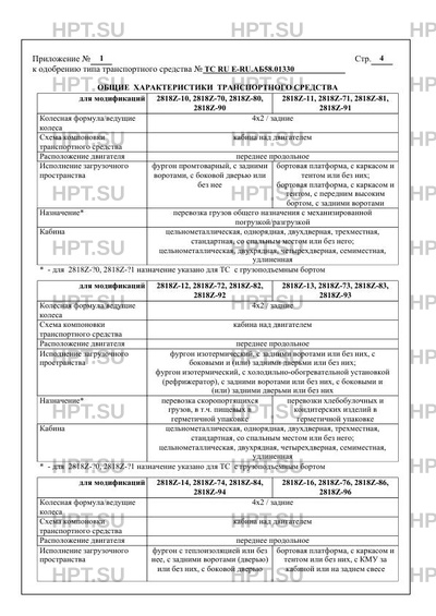 | Исполнение загрузочного пространства | фургон промтоварный, с задними воротами, с боковой дверью или без нее бортовая платформа, с каркасом и тентом или без них; бортовая платформа, с каркасом и тентом, с передним высоким бортом, с задними воротами фургон изотермический, с задними воротами или без них, с боковыми и (или) задними дверьми или без них; фургон изотермический, с холодильно-обогревательной установкой (рефрижератор), с задними воротами или без них, с боковыми и (или) задними дверьми или без них ми или без них, с боковыми и (или) задними дверьми или без них; рижератор), с задними воротами или без них, с боковыми и (или) задними дверьми или без них фургон с теплоизоляцией или без нее, с задними воротами (дверью) или без них, с боковой дверью бортовая платформа, с каркасом и тентом или без них, с КМУ за кабиной или на заднем свесе или без нее, с окнами или без них, с бортовой платформой позади фургона специальная фиксированная платформа; специальная сдвигающаяся платформа фургон изотермический, с задней и/или боковой дверью, с окнами/витражами или без них |