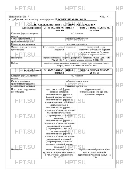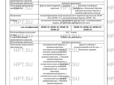 | Назначение | механизированная погрузка/разгрузка и перевозка грузов (для 2818E -?0 и 2818E -?1 с грузоподъемным бортом, 2818E -?6) грузов (для 2818E -?0 и 2818E -?1 с грузоподъемным бортом, 2818E -?6) перевозка скоропортящихся грузов, в т.ч. продуктов питания, в герметичной упаковке (для 2818E -?2) перевозка хлебобулочных и/или кондитерских изделий в герметичной упаковке (для 2818E -?3) перевозка оборудования, инструмента, приспособлений, приборов лаборатории или мастерской, с возможностью размещения рабочих бригад (персонала) на стоянке, перевозка оборудования офиса, передвижного клуба, жилого модуля, транспортно-бытовой машины, грузопассажирского автомобиля, пункта управления и связи, командно-штабной машины; Исполнения: - аварийная мастерская, - аварийноремонтная мастерская (АРМ), - передвижная-ремонтная мастерская (ПРМ), - передвижная аварийно-ремонтная мастерская (ПАРМ), - передвижная авторемонтная мастерская (ПАРМ), - мастерская аварийновосстановительных работ (МАВР); - агрегат ремонтно-сварочный (АРС), - передвижной комплект сварочных работ (ПКСР), - аварийная газовая служба (АГС), - мастерская дорожной службы "Дорожный мастер", - передвижная электростанция (ПЭС), - перегонная дизельная электростанция, - автолаборатория, - передвижная лаборатория, - передвижная лаборатория связи, - передвижная механизированная погрузка/разгрузка и перевозка грузов (для 2818E -?0 и 2818E -?1 с грузоподъемным бортом, 2818E -?6) лаборатория телематики; - передвижная лаборатория неразрушающего контроля (ЛКН), - передвижная электротехническая лаборатория, - передвижная экологическая лаборатория, - передвижная метрологическая лаборатория, - передвижной офис, передвижной клуб, - передвижной медицинский комплекс (пункт) "Медицинская помощь"; - передвижная техническая помощь, - транспортно-бытовая машина, жилой модуль, - автомобиль почтовый (для 2818E -?4) погрузка/разгрузка и перевозка автомобилей и спецтехники (автовоз, автоэвакуатор) (для 2818E -?7) передвижной магазин для выездной торговли (для 2818E-? 8) |