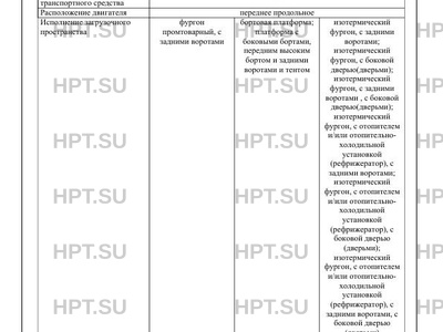 | Исполнение загрузочного пространства | фургон промтоварный, с задними воротами бортовая платформа; платформа с боковыми бортами, передним высоким бортом и задними воротами и тентом изотермический фургон, с задними воротами; изотермический фургон, с боковой дверью(дверьми); изотермический фургон, с задними воротами , с боковой дверью(дверьми); изотермический фургон, с отопителем и/или отопительнохолодильной установкой (рефрижератор), с задними воротами; изотермический фургон, с отопителем и/или отопительнохолодильной установкой (рефрижератор), с боковой дверью (дверьми); изотермический фургон, с отопителем и/или отопительнохолодильной установкой (рефрижератор), с задними воротами, с боковой дверью (дверьми) фургон хлебный, с теплоизоляцией или без нее . с боковыми дверями фургон с теплоизоляцией или без нее , с дверью (дверьми) бортовая платформа, с каркасом и тентом или без них, с краноманипуляторно й установкой (КМУ) за кабиной специальная стационарная платформа; специальная сдвижная платформа фургон с теплоизоляцией или без нее, с дверью (-ми), с освещением |