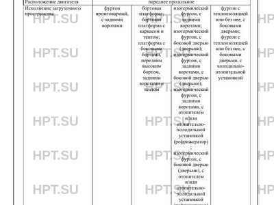 | Исполнение загрузочного пространства | фургон промтоварный, с задними воротами бортовая платформа; бортовая платформа с каркасом и тентом; платформа с боковыми бортами, передним высоким бортом, задними воротами и тентом изотермический фургон, с задними воротами; изотермический фургон, с боковой дверью (дверьми); изотермический фургон, с задними воротами, с боковой дверью (дверьми); изотермический фургон, с задними воротами, с отопителем и/или отопительнохолодильной установкой (рефрижератор) ; изотермический фургон, с боковой дверью (дверьми), с отопителем и/или отопительнохолодильной установкой (рефрижератор) ; изотермический фургон, с задними воротами, с боковой дверью (дверьми), с отопителем и/или отопительнохолодильной фургон с теплоизоляцией или без нее, с боковыми дверьми; фургон с теплоизоляцией или без нее, с боковыми дверьми, с холодильноотопительной установкой установкой (рефрижератор) |