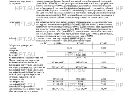 | Исполнение загрузочного пространства | самосвальная платформа с боковой или задней или трёхсторонней разгрузкой (для 45904A, 45904B); платформа сортиментовозная с кониками, с устройством защиты кабины (для 45904C); самосвальная платформа с боковой или задней или трёхсторонней разгрузкой, с краноманипуляторной установкой за кабиной (для 45904D); бортовая платформа с краноманипуляторной установкой за кабиной (для 45904G); самосвальный кузов с разгрузкой назад, краноманипуляторная установка за кабиной (для 45904M); платформа сортиментовозная с кониками, с устройством защиты кабины, с гидроманипулятором на заднем свесе (для 45904S) |