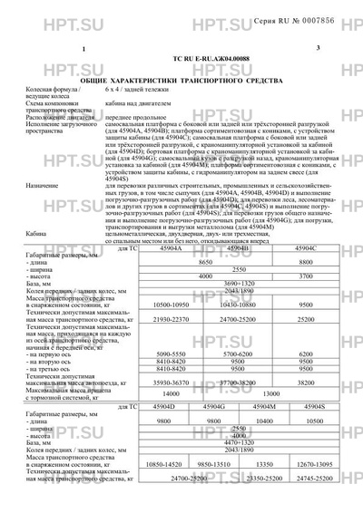 | Назначение | для перевозки различных строительных, промышленных и сельскохозяйственных грузов, в том числе сыпучих (для 45904A, 45904B, 45904D) и выполнение погрузочно-разгрузочных работ (для 45904D); для перевозки леса, лесоматериалов и других грузов в сортиментах (для 45904С, 45904S) и выполнение погрузочно-разгрузочных работ (для 45904S); для перевозки грузов общего назначения и выполнение погрузочно-разгрузочных работ (для 45904G); для погрузки, транспортирования и выгрузки металлолома (для 45904M) |