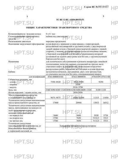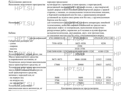 | Дополнительная информация | Транспортные средства 4761 изготавливаются в модификациях 4761-0000010-01, 47610-09. Транспортные средства 47611 изготавливаются в модификациях 47611-08, 47611-0000010 Для изготовления транспортных средств в модификации 4761-0000010-01 применяется модификация шасси КАМАЗ 5350-D5. Для изготовления транспортных средств в модификации 47610-09 применяется модификация шасси КАМАЗ 5350-37. Для изготовления транспортных средств в модификации 47611-08 применяется модификация шасси КАМАЗ 43118-37. Для изготовления транспортных средств в модификации 47611-0000010 применяются модификации шасси КАМАЗ 43118-А5, 43118-50, 43118-RR, 43118-RS. Транспортные средства не предназначены для перевозки пищевых продуктов и опасных грузов. В соответствии с системой SAP (System Analysis and Program Development), применяемой изготовителем шасси, буквенно-цифровому обозначению модификации шасси 43118-А5 соответствует вариант обозначения для формализованного (цифрового) кода продукции в процессе производства и отгрузки 43118-48, а для 5350-D5 – 5350-66. |