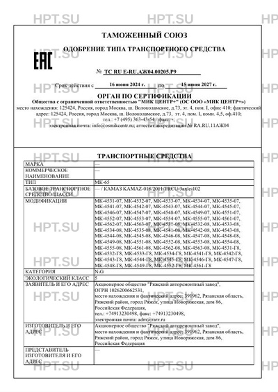 | Предприятие-изготовитель | Акционерное общество "Ряжский авторемонтный завод", место нахождения и фактический адрес: 391962, Рязанская область, Ряжский район, город Ряжск, улица Новоряжская, дом 86, Российская Федерация |