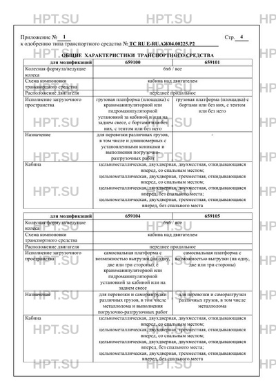 | Оборудование ТС | устройство ограничения максимальной скорости (функцию устройства ограничения максимальной скорости выполняет электронный блок управления двигателем); дневные ходовые огни; устройство вызова экстренных оперативных служб с функцией автоматического срабатывания при опрокидывании по заказу: предпусковой подогреватель двигателя; лебедка; коробка отбора мощности; кондиционер; передние противотуманные фары (кроме ТС на базе модификаций шасси или базовых ТС, имеющих официальное утверждение на основании Правил ООН № 48-04); специальные предупреждающие огни; съемные коники; тент; каркас; система увязки воза; инструментальный ящик; противооткатные упоры |