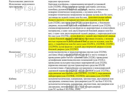 | Оборудование ТС | '- устройство вызова экстренных оперативных служб с ручным включением и автоматическим срабатыванием при опрокидывании, - система регулирования давления воздуха в шинах (для ТС на базе 33081, 33088), - дневные ходовые огни (для ТС на базе ГАЗ C4), - устройства освещения рабочей зоны, - цистерна для воды вместимостью 800 – 2700 л, автономный отопитель дополнительной кабины боевого расчета, автономный отопитель отсека для оборудования, сигнально-громкоговорящая установка и один проблесковый маяк синего цвета, фары-искатели, (для 2322К), - проблесковый маячок автожелтого (оранжевого) цвета, защита аккумуляторных батарей, устройство ограничения скорости, система пожаротушения, глушитель с искрогасителем, дополнительный инструментальный ящик, защитные кожухи топливных баков (для 2322Т) - по заказу: устройство ограничения максимальной скорости (функцию устройства выполняет электронный блок управлением двигателя), лебедка, второй топливный бак, предпусковой подогреватель, тахограф, трансформируемые сиденья второго ряда, отопитель, магнитола, противотуманные фары, кондиционер, ящики для инструмента, дополнительный отопитель. |