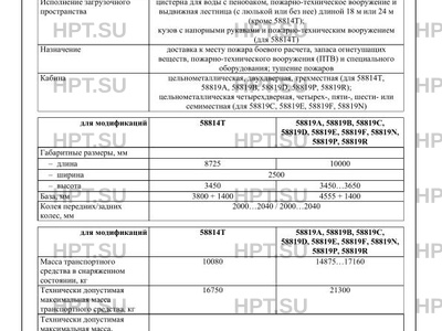 | Исполнение загрузочного пространства | цистерна для воды с пенобаком, пожарно-техническое вооружение и выдвижная лестница (с люлькой или без нее) длиной 18 м или 24 м (кроме 58814Т); кузов с напорными рукавами и пожарно-техническим вооружением (для 58814Т) |