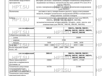 | Исполнение загрузочного пространства | цистерна для воды с пенобаком, пожарно-техническое вооружение и выдвижная лестница (с люлькой или без нее) длиной 18 м или 24 м (кроме 58814Т); кузов с напорными рукавами и пожарно-техническим вооружением (для 58814Т) |