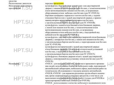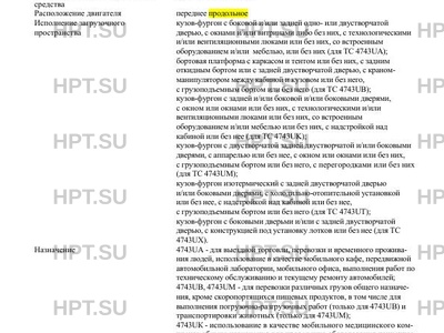 | Исполнение загрузочного пространства | кузов-фургон с боковой и/или задней одноили двустворчатой дверью, с окнами и/или витринами либо без них, с технологическими и/или вентиляционными люками или без них, со встроенным оборудованием и/или мебелью, или без них (для ТС 4743UA); бортовая платформа с каркасом и тентом или без них, с задним откидным бортом или с задней двустворчатой дверью, с краномманипулятором между кабиной и кузовом или без него, с грузоподъемным бортом или без него (для ТС 4743UB); кузов-фургон с задней и/или боковой и/или боковыми дверями, с окном или окнами или без них, с технологическими и/или вентиляционными люками или без них, со встроенным оборудованием и/или мебелью или без них, с надстройкой над кабиной или без нее (для ТС 4743UK); кузов-фургон с двустворчатой задней двустворчатой и/или боковыми дверями, с аппарелью или без нее, с окном или окнами или без них, с грузоподъемным бортом или без него, с перегородками или без них (для ТС 4743UM); кузов-фургон изотермический с задней двустворчатой дверью и/или боковыми дверями, с холодильно-отопительной установкой или без нее, с надстройкой над кабиной или без нее, с грузоподъемным бортом или без него (для ТС 4743UT); кузов-фургон с боковыми дверьми и/или с задней двустворчатой дверью, с конструкцией под установку лотков или без нее (для ТС 4743UХ). |