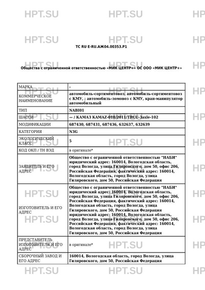 | Номер документа | ТС RU Е-RU.АЖ04.00353.Р1 |
