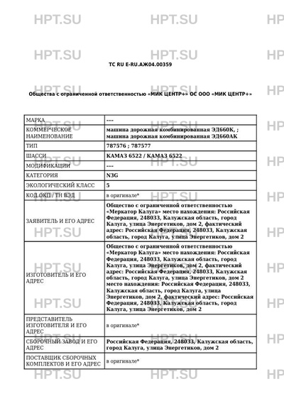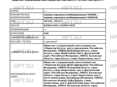 | Дополнительная информация | Транспортные средства 787576, коммерческое наименование машина дорожная комбинированная ЭД660К изготавливаются на шасси КАМАЗ 6522 модификации 6522-53, 6522-RT. Транспортные средства 787577, коммерческое наименование машина дорожная комбинированная ЭД660AК изготавливаются на базовом транспортном средстве КАМАЗ 6522 модификация 6522-53. Показатели масс не могут превышать максимальных для конкретного шасси и базового транспортного средства, указанных в одобрении типа шасси (базового транспортного средства), на табличке изготовителя шасси (базового транспортного средства) и в его сопроводительной документации. В случае фактического превышения значений параметров, указанных в приложении № 5 к техническому регламенту Таможенного союза «О безопасности колесных транспортных средств», для передвижения транспортных средств по территории государств-членов Евразийского экономического союза необходимо оформление специального разрешения. |
