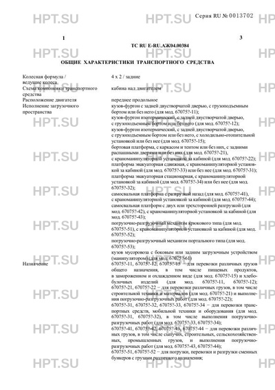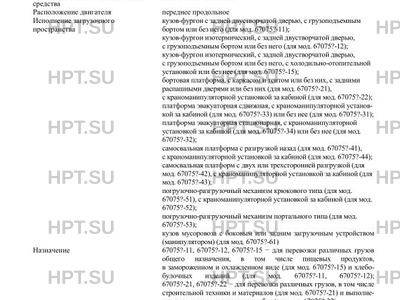 | Назначение | 67075?-11, 67075?-12, 67075?-15 - для перевозки различных грузов общего назначения, в том числе пищевых продуктов, в замороженном и охлажденном виде (для мод. 67075?-15) и хлебобулочных изделий (для мод. 67075?-11, 67075?-12); 67075?-21, 67075?-22 - для перевозки различных грузов, в том числе строительной техники и материалов (для мод. 67075?-21) и выполнения погрузочно-разгрузочных работ (для мод. 67075?-22); 67075?-31, 67075?-32, 67075?-33, 67075?-34 - для перевозки транспортных средств, мобильной техники и оборудования (для мод. 67075?-31, 67075?-32), в том числе выполнения погрузочноразгрузочных работ (для мод. 67075?-33, 67075?-34); 67075?-41, 67075?-42, 67075?-43, 67075?-44 - для перевозки различных грузов, в том числе сыпучих, строительных, сельскохозяйственных, промышленных грузов, и выполнения погрузочноразгрузочных работ (для мод. 67075?-43, 67075?-44); 67075?-51, 67075?-52 - для погрузки, перевозки и разгрузки сменных бункеров с грузами различного назначения; 4 67075?-53 - для погрузки, транспортирования и снятия сменных кузовов (бункеров) с твердыми бытовыми отходами (ТБО), в том числе с крупногабаритным бытовым и строительным мусором от жилых массивов и строительных площадок; 67075?-61 - для сбора ТБО из контейнеров, а так же ручного сбора ТБО, их уплотнения, транспортировки и механизированной выгрузки в местах обезвреживания и утилизации |