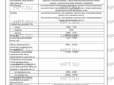 | Оборудование ТС | устройство ограничения максимальной скорости (функцию устройства ограничения максимальной скорости выполняет электронный блок управления двигателем); дневные ходовые огни устройство вызова экстренных оперативных служб с функцией автоматического срабатывания при опрокидывании; емкости для жидкости; рукава высокого давления; насос высокого давления; насос для откачки и перекачки жидкости; размывочный барабан; гидропривод вращения барабана; отопительная установка; устройства освещения рабочей зоны; два проблесковых маячка автожелтого цвета по заказу: предпусковой подогреватель двигателя; кондиционер (хладагент R134a); передние противотуманные фары (для транспортных средств на базе шасси, официально утвержденных на основании Правил ООН № 48-05); противооткатные упоры |