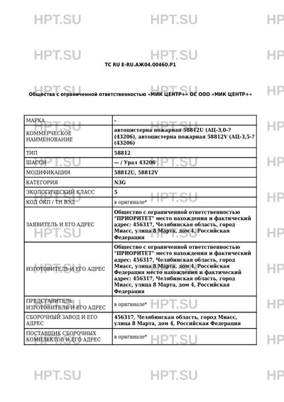 Заявитель Общество с ограниченной ответственностью "ПРИОРИТЕТ" место нахождения и фактический адрес: 456317, Челябинская область, город Миасс, улица 8 Марта, дом 4, Российская Федерация