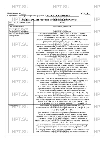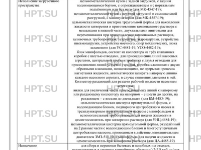 | Исполнение загрузочного пространства | цельнометаллический кузов с задней загрузкой, с задним поднимающимся бортом, с опрокидывателем и с портальным подъёмником или без него (для МК-454?-19); цельнометаллический кузов с верхней загрузкой и самосвальной разгрузкой, с манипулятором (для МК-455?-19); цельнометаллическая цистерна треугольной формы для накопления жидкости затворения и приготовления тампонажного раствора с мешалками в нижней части, двухвальными винтовыми для перемешивания при приготовлении тампонажных растворов, заливочных трубопроводов, устройства гидрозагрузки, устройства пневмозагрузки, устройства моечного, опор механических, люка шламового (для УС-4481-19, УСО-4482-19); блок манифольдов, состоит из коллектора из трёх клапанных коробок с шестью отводами, для присоединения линий насосных агрегатов, центральной трубы и тройника с двумя отводами для присоединения линий устьевой головки, коробка клапанная с двумя обратными клапанами, позволяющими, не прерывая процесса нагнетания жидкости, автоматически запирать напорную линию каждого насосного агрегата, в случае снижения давления в ней. Коллектор раздающий для раздачи рабочей жидкости насосным агрегатам; вилки для увеличения числа присоединяемых линий к напорному или раздающему коллектору на напорном - с шести до десяти, на раздающем - с восьми до двенадцати (для БМ-4483-19); цельнометаллическая цистерна прямоугольной формы, с водоподающим блоком, подпорного центробежного насоса и трехплунжерным горизонтальным насосом с манифольдом и вспомогательным трубопроводом для подачи жидкости в цементосмеситель при затворении раствора (для УНЦ-4484-19); цельнометаллическая цистерна прямоугольной формы, разделённый на 2 равные части с водоподающим блоком и многоступенчатым центробежным насосом, приводимым в действие дополнительным двигателем ЗМЗ-511.10, и манифольда для подачи жидкости в цементосмеситель при затворении раствора (для ЦА-4485-19) |